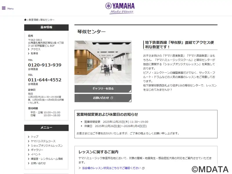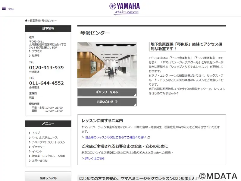 安全と環境にこだわったヤマハユニスタイル教室北海道第一号店として開業。2016年7月に地下鉄東西線「琴似駅」3番口直結、紀伊國屋ビルB2Fに移転。お子様のグループレッスンからピアノ・エレクトーン、ギター・ドラム・サックス・フルート・バイオリン・ボーカルなど多彩な大人の音楽レッスン、お試し感覚で始められるデイタイムレッスンや「音楽を楽しむ3ヶ月レッスン」も充実。