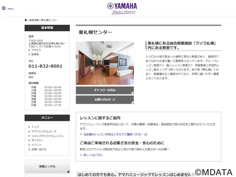 札幌市の地下鉄東札幌駅から徒歩3分のラソラ札幌(旧イーアス札幌パークタウン)2Fにあるヤマハミュージックのレッスンセンター。グループレッスン教室3部屋、個人レッスン教室3部屋、英語教室と多目的レッスンルームを各1つ完備し、子供から大人まで幅広い年齢層に対応した様々なレッスンを提供。クラシックからポピュラー、ジャズまで多様なジャンルの音楽レッスンがあり、初心者から経験者まで自分のペースで楽しく学べる。