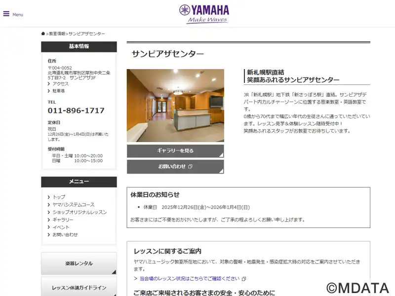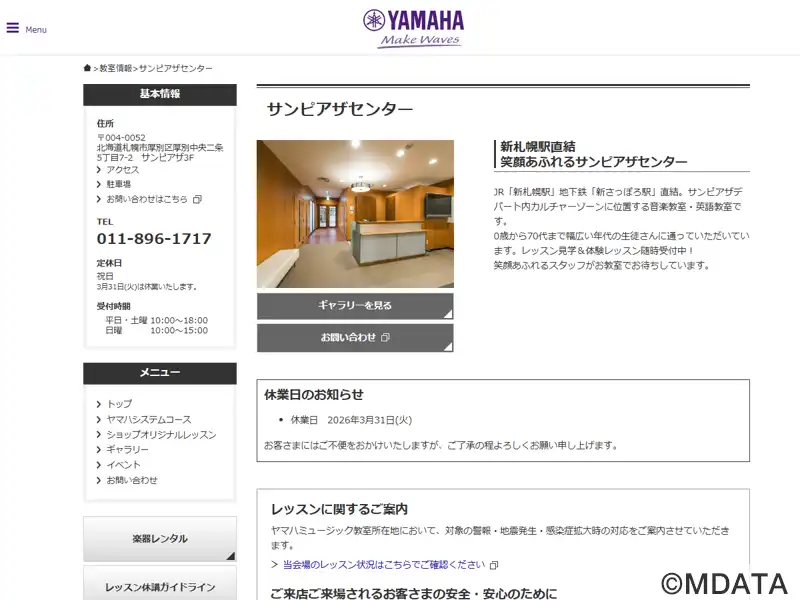 札幌市厚別区にある、ヤマハ認定講師による共通テキスト、カリキュラムでレッスンを行うレッスンセンター。音楽を通してこころを育てる「ヤマハ音楽教室」と、大人の方にぴったりの音楽の習い事「大人のヤマハ音楽教室」のほか「ヤマハ英語教室」「歌って踊れる青春ポップス」を開講している。オリジナルコースとしてピアノ、エレクトーン、サックス、フルート、ハープ、歌などのコースを用意する。JR新札幌駅・地下鉄新さっぽろ駅直結。
