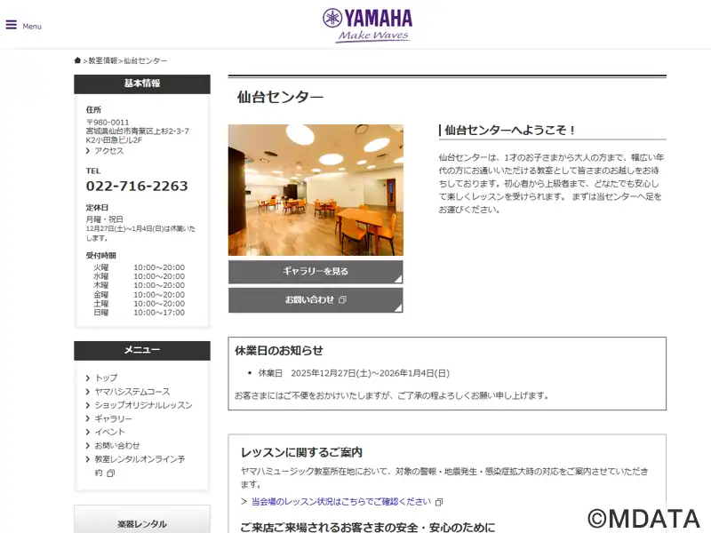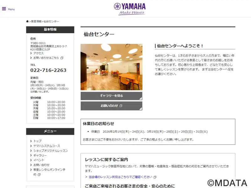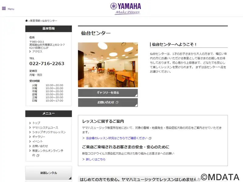 仙台市青葉区にあるヤマハ認定講師による共通テキスト、カリキュラムでレッスンを行うレッスンセンター。音楽を通してこころを育てる「ヤマハ音楽教室」と、大人の方にぴったりの音楽の習い事「大人のヤマハ音楽教室」を開講。オリジナルコースとしてピアノ、エレクトーン、オカリナ、サックス、バイオリン、フルート、踊りのコースも用意している。広々とくつろげるロビーに、空いているレッスン室は練習室として利用可能。