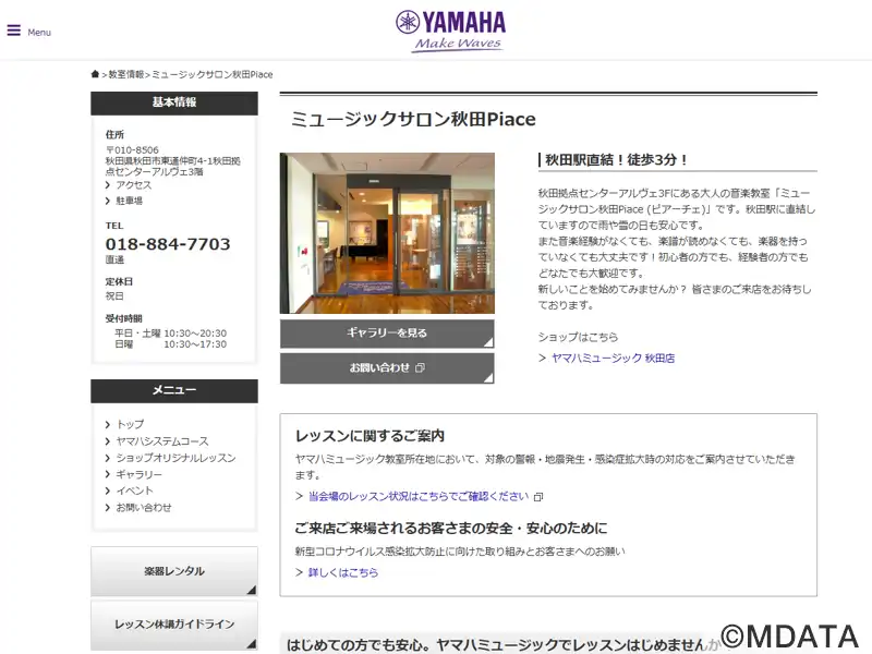 秋田市にあるヤマハ認定講師による共通テキスト、カリキュラムでレッスンを行うレッスンセンター。大人の方にぴったりの音楽の習い事「大人のヤマハ音楽教室」を開講している。オリジナルコースとしてピアノ、ギター、サックス、ドラム、トランペット、トロンボーン、バイオリン、ハープ、フルート、ボーカルのコースも用意している。秋田駅直結の秋田拠点センターアルヴェ内3階。買い物ついでに、仕事帰りに、便利に通えるロケーション。