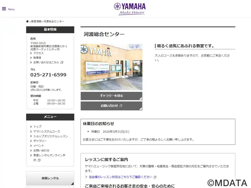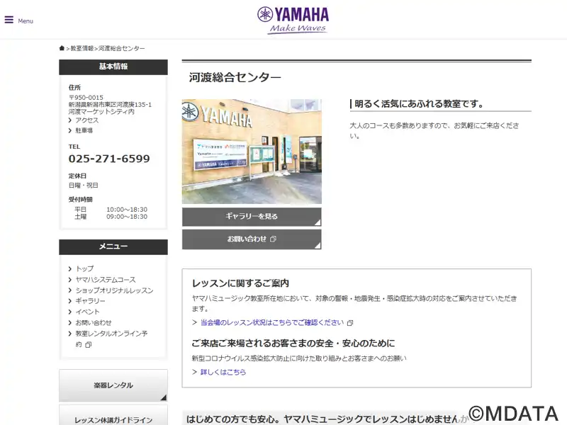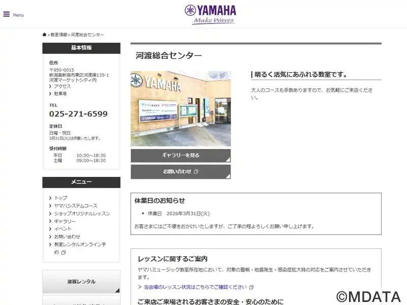 新潟市東区にあるヤマハ認定講師による共通テキスト、カリキュラムでレッスンを行うレッスンセンター。音楽を通してこころを育てる「ヤマハ音楽教室」と、大人の方にぴったりの音楽の習い事「大人のヤマハ音楽教室」「ヤマハ英語教室」などを開講している。オリジナルコースとしてピアノ、ギター、ウクレレ、サックス、ドラム、バイオリン、フルートのコースも用意している。広々とした木目調のロビーではミニコンサートも開催される。