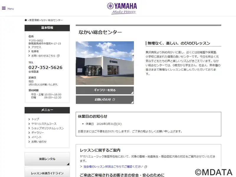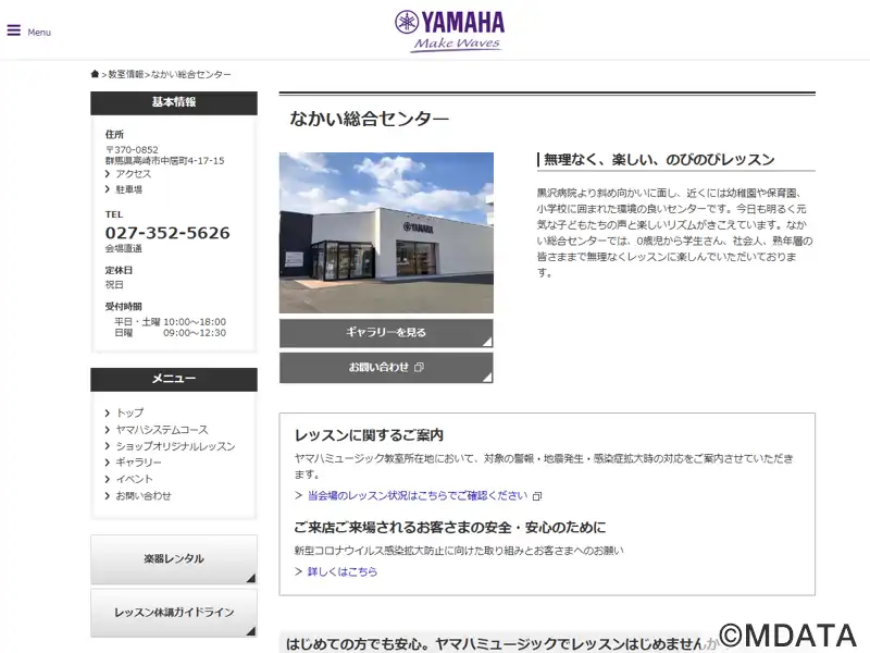 高崎市にあるヤマハレッスンセンターで、広々とした開放的なロビーに、全室グランドピアノ常設。ヤマハ認定講師による共通テキストとカリキュラムに基づくレッスンコースが用意されており、子供向けの「ヤマハ音楽教室」と大人にぴったりの「ヤマハミュージックレッスン」「歌って踊れる青春ポップス」、ショップオリジナルのピアノ、エレクトーン、アコースティックギター、ウクレレコースを開講している。専用駐車場22台あり。