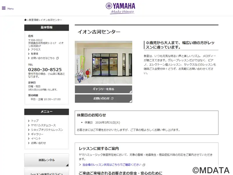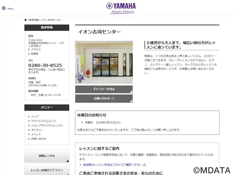 古河市の国道4号沿いイオン古河店1階にあるヤマハレッスンセンター。ヤマハ認定講師による共通テキストとカリキュラムに基づくレッスンコースが用意されており、子供向けの「ヤマハ音楽教室」「ヤマハ英語教室」と大人にぴったりの「ヤマハミュージックレッスン」、ショップオリジナルのボーカル、ピアノ、エレキギター、アコースティックギター、サックス、エレクトーン、コーラスコースを開講している。イオンの無料駐車場あり。