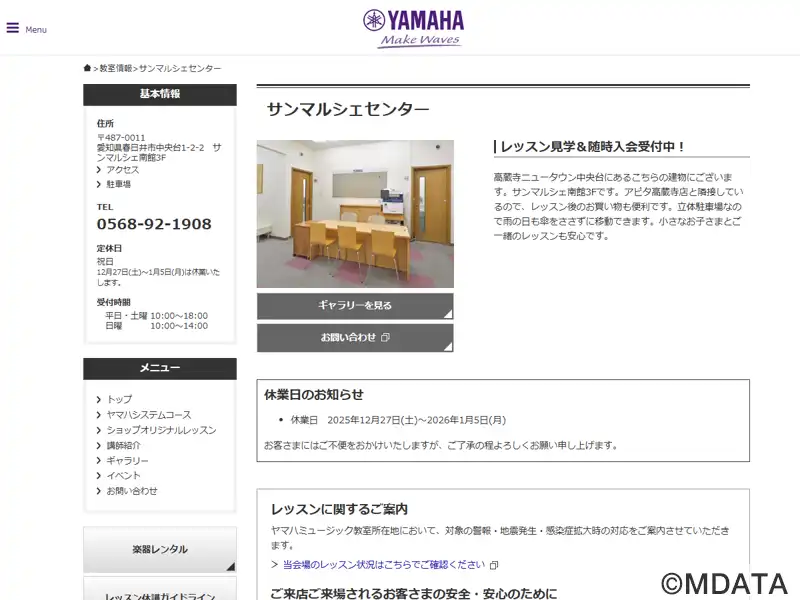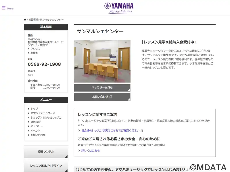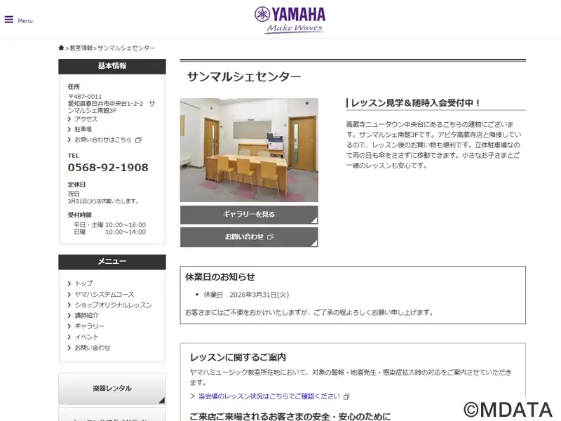 春日井市にあるショッピングセンターサンマルシェ南館3階にある音楽教室。ヤマハ認定講師による共通テキスト、カリキュラムでレッスンを行う。音楽を通してこころを育てる「ヤマハ音楽教室」と、大人の方にぴったりの音楽の習い事「大人のヤマハ音楽教室」を開講している。オリジナルコースとしてピアノ、エレクトーン、ウクレレ、ギター、サックス、ハープ、ボーカルのコースも用意している。練習のための教室レンタルも可能。