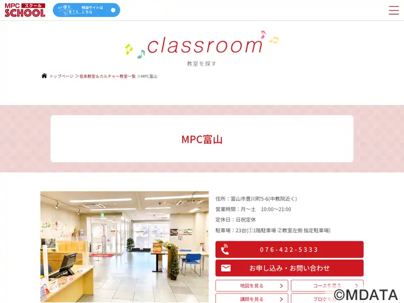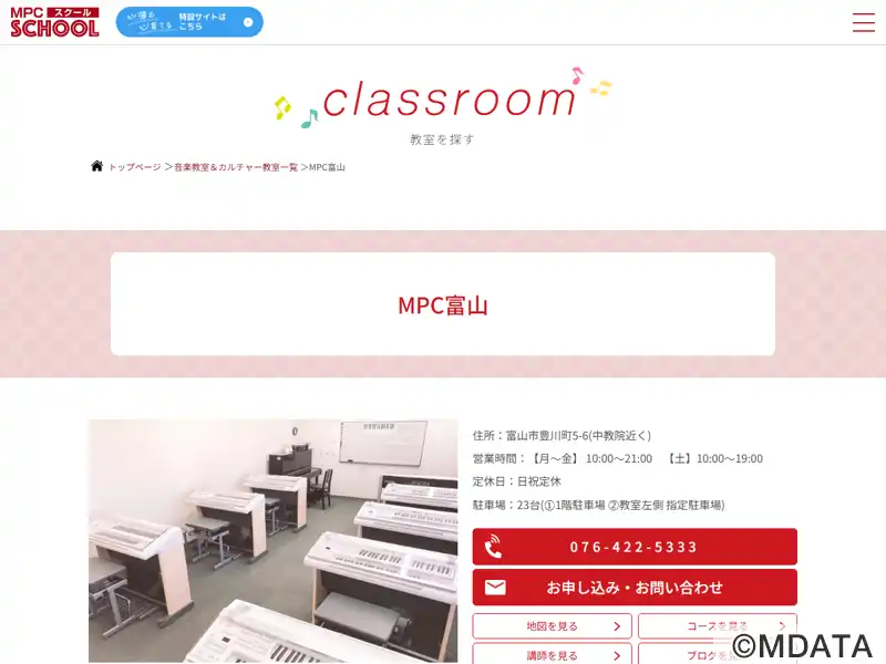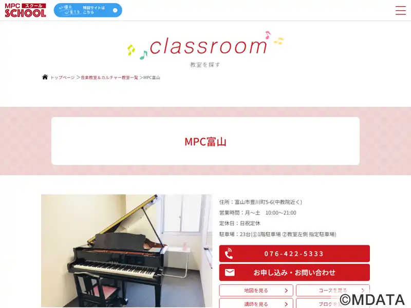 富山市豊川町にある開進堂楽器MPCスクールの富山レッスンセンターで。グランドピアノ完備の個人レッスン部屋、グループレッスン室、イベントホールを備える。MPCミュージック&カルチャーが提供するピアノ・エレクトーンの個人レッスン、大人のピアノ、バイオリン、フルート、ドラム、パーカッション、オカリナなどの各コースに加え、子供向けの「ヤマハ音楽教室」、大人向けの「ヤマハミュージックレッスン」なども開講する。