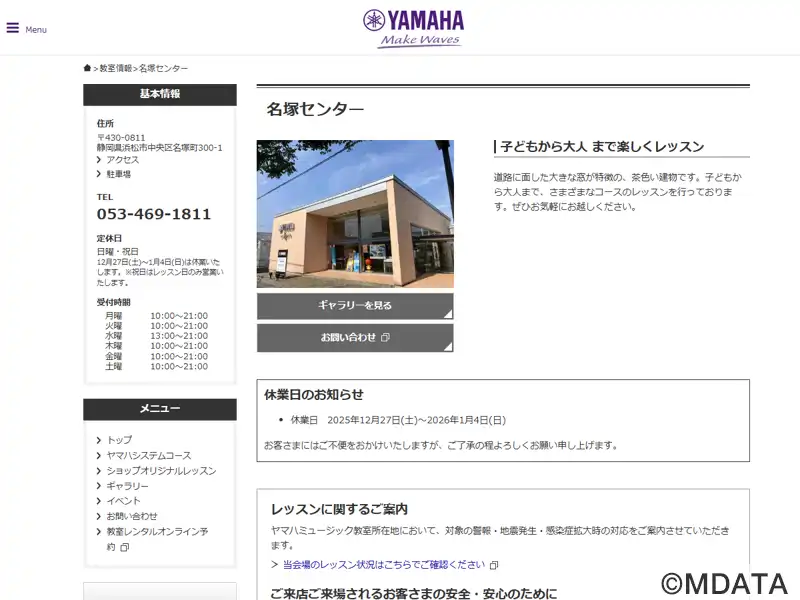 浜松市中区にある音楽教室。ヤマハ認定講師による共通テキスト、カリキュラムでレッスンを行う。音楽を通してこころを育てる「ヤマハ音楽教室」と、大人の方にぴったりの音楽の習い事「大人のヤマハ音楽教室」のほか「ヤマハ英語教室」「歌って踊れる青春ポップス」を開講するレッスンセンター。オリジナルコースとしてピアノ、エレクトーン、ギター、ウクレレ、オカリナ、サックス、バイオリン、フルートのコースも用意している。