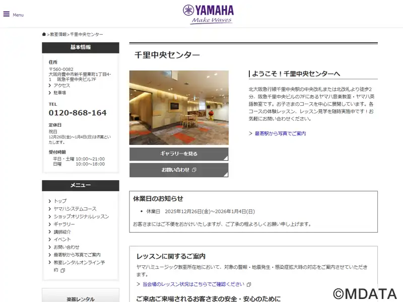 北大阪急行線千里中央駅より徒歩2分、阪急千里中央ビルの7階にあるヤマハレッスンセンター。フリーWiFiの、明るいラウンジスペースあり。ヤマハ認定講師による共通テキストとカリキュラムに基づくレッスンコースが用意されており、子供向けの「ヤマハ音楽教室」と「ヤマハ英語教室」、ショップオリジナルの小学生のための歌のグループレッスン「Let's Sing~ビートを感じて楽しく歌おう~」コースを開講している。