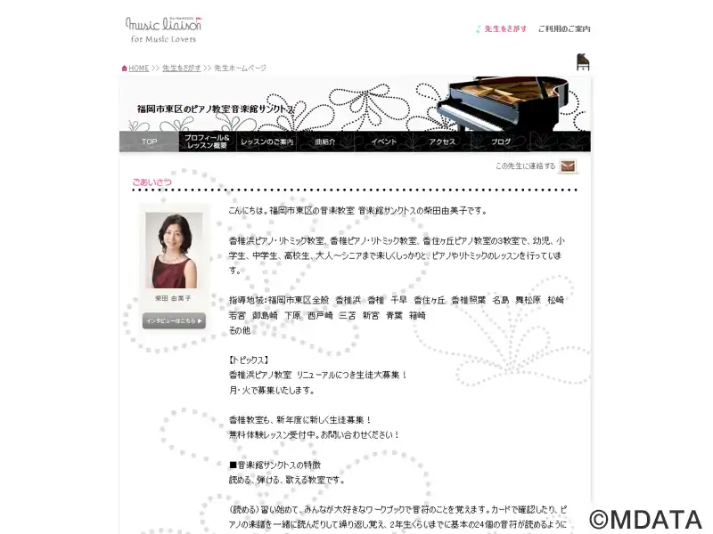 福岡市東区に拠点を置き、香椎浜、香椎、香住ヶ丘の3つの教室で、幼児からシニアまでピアノとリトミックのレッスンを行う音楽教室。「読める」「弾ける」「歌える」という3つのスキルを重視し、音符の理解や演奏技術の向上、楽譜の歌唱能力の向上に重点を置いている。演奏技術を追求する生徒は、全国的なピアノコンクールに出場するまでの成長。また、趣味として音楽を楽しむ生徒にも対応している。体験レッスンも開校している。