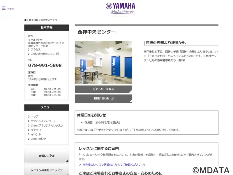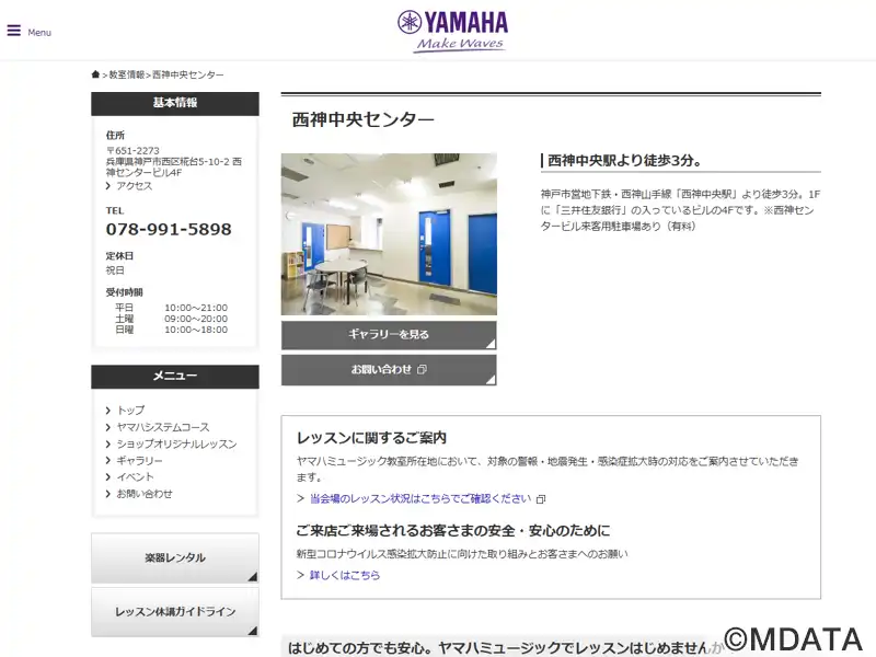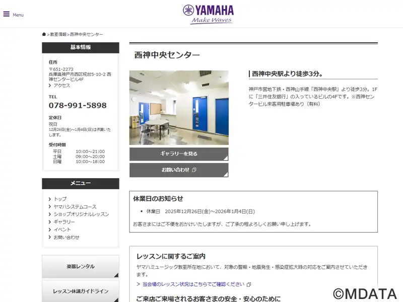 地下鉄西神中央駅より徒歩3分のセンタービル4階にあるヤマハレッスンセンター。ヤマハ認定講師による共通テキストとカリキュラムに基づくレッスンコースが用意されており、子供向けの「ヤマハ音楽教室」と大人にぴったりの「ヤマハミュージックレッスン」「歌って踊れる青春ポップス」、ショップオリジナルのピアノ、エレクトーン、歌、踊りのコースを開講している。1歳〜2歳児向けの、じゅうたんのレッスンルームもあり。