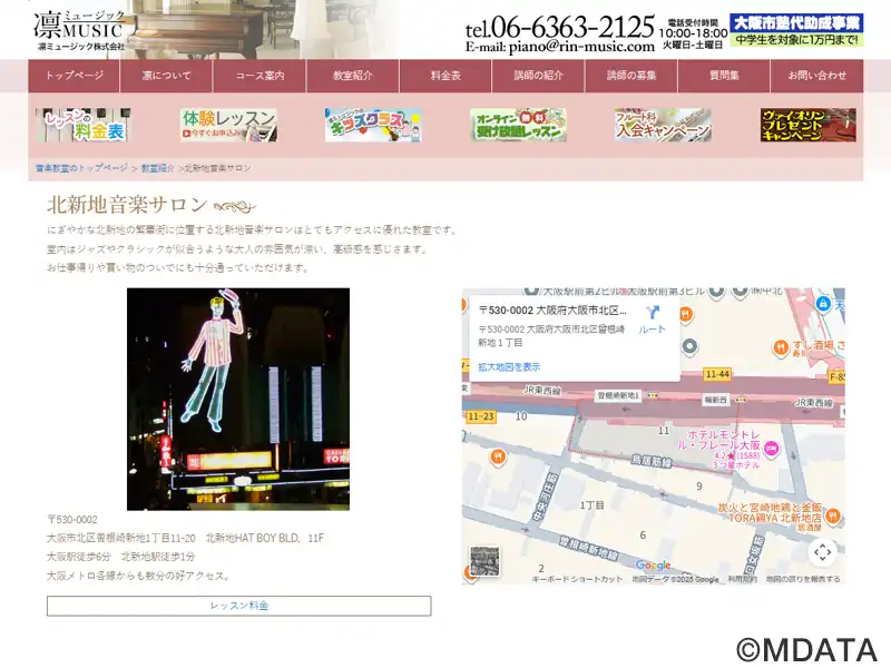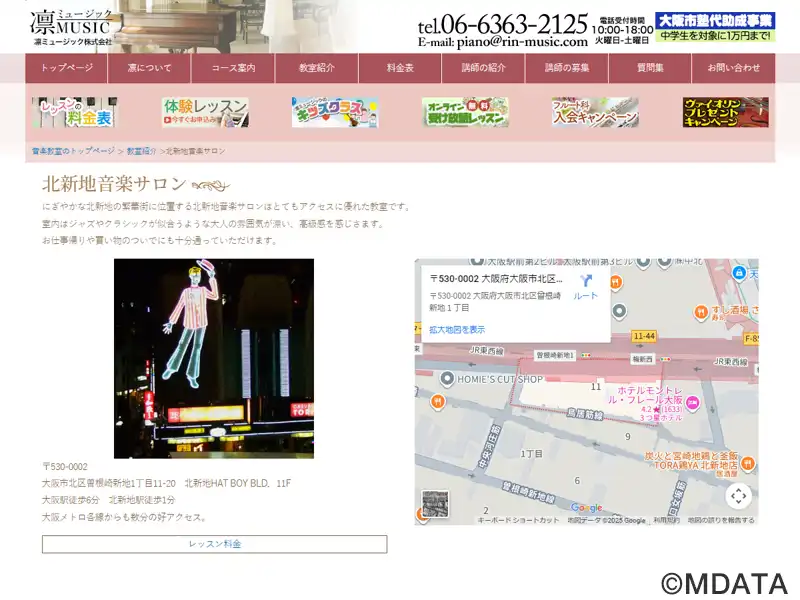 大阪市北区の北新地の繁華街にあるピアノ教室「凛ミュージック」の北新地教室。ジャズやクラシックが似合う、大人の雰囲気が溢れる教室。ピアノ、ヴァイオリン、ギター、アンサンブルなど、豊富なレッスンを開講する。全年齢、性別の方に適した環境で、親切な講師が丁寧に指導する。深夜まで利用できるので小さな子どもから主婦、忙しいサラリーマンまで通える。楽器のレンタルもあるので仕事帰りや学校帰りに、手ぶらでも受講できる。