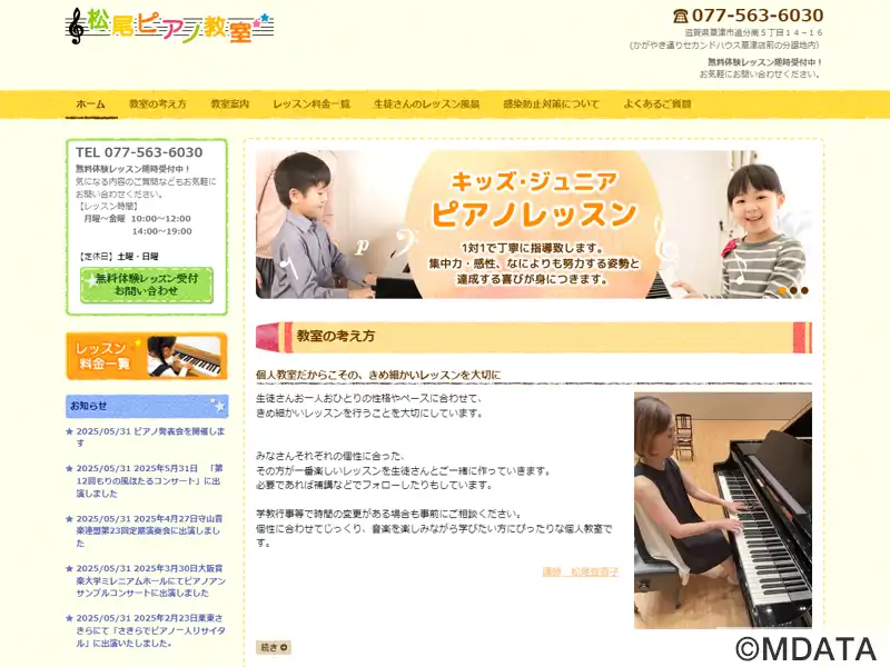 滋賀県草津の、カトリック幼稚園前にあるピアノ教室。ピアノ演奏活動を行う松尾登喜子氏(大阪音楽大学ピアノ科卒)が主宰する。個性を大切にしたきめ細かいレッスンを行っていて、3歳から7歳までの絶対音感教育、コンクール、音楽学校受験、幼稚園・小学校教員レッスンにも対応する。また、大人のピアノでは「楽しむ」をテーマに、昔にレッスンをやめてしまった方も、もう1度チャレンジして憧れの曲を弾けるように指導している。