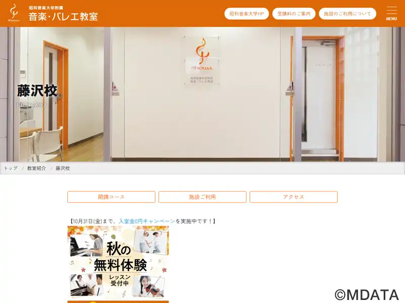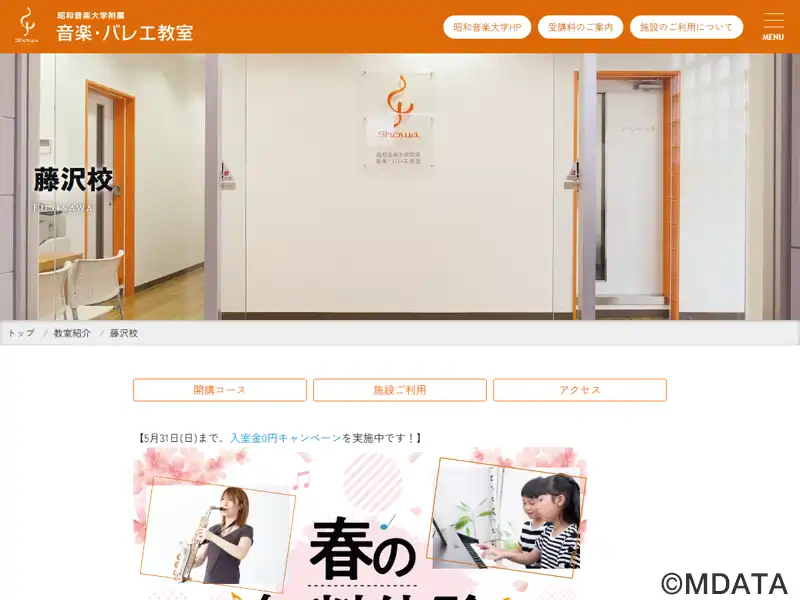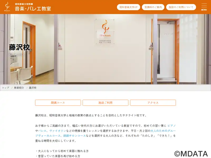 江ノ電が見える藤沢市の音楽・バレエ教室。藤沢校には5つのレッスン室とスタジオがあり、昭和音楽大学附属の指導法に基づき、2歳から中高年まで、年齢や経験問わず、各自のレベルに合わせたレッスンを提供している。ピアノ、管楽器、弦楽器、声楽、作曲、ソルフェージュなどの個人レッスン、ダンスやミュージカルなどのグループレッスン、音大受験・進学のためのコースなど幅広い科目を開講。練習室の貸出も行っている。
