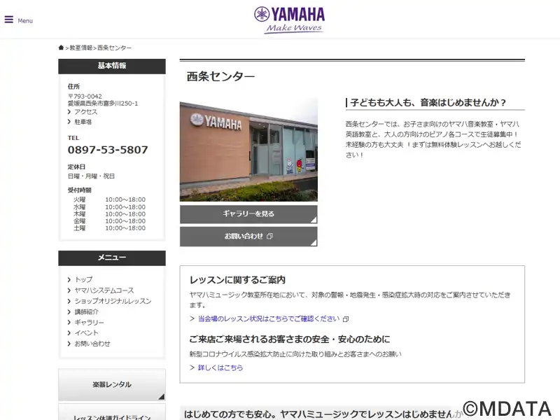 西条市にあるヤマハ認定講師による共通テキスト、カリキュラムでレッスンを行うレッスンセンター。音楽を通してこころを育てる「ヤマハ音楽教室」と、大人の方にぴったりの音楽の習い事「大人のヤマハ音楽教室」のほか「ヤマハ英語教室」などを開講している。「弾く」だけでなく「聴き、歌い、読む、つくる」体験を重ねることで総合的な音楽力を育む。ピアノ、バイオリン、ボーカル、歌などのオリジナルコースも用意している。