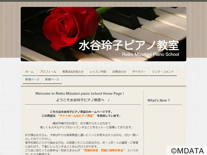 横浜市磯子区杉田にあるピアノ教室。水谷玲子氏(大阪音楽大学ピアノ科卒)が主宰するアットホームなピアノレッスン。1対1の個人レッスンで、音符を読むことから始める方も、以前に習ったことのある方も、進度や希望に合わせたレッスンを行っている。ソルフェージュも対応可能。レッスン室にはボストングランドピアノとヤマハアップライトピアノを完備。新杉田駅からバス215系統で「杉田梅林」下車すぐ、駐車場あり。