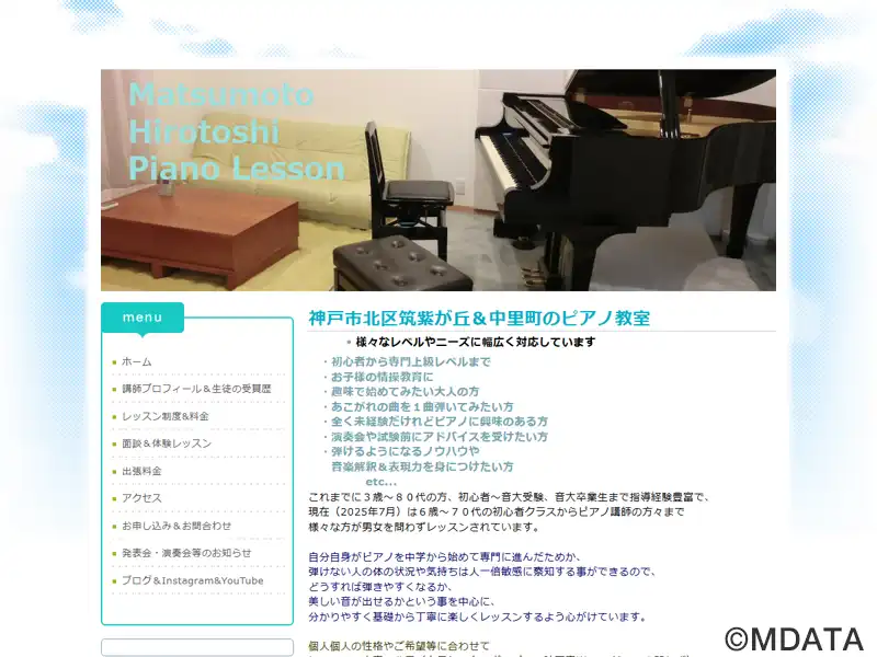 神戸市北区にある、松本宙稔氏が主宰するピアノ教室。筑紫が丘(24時までレッスン可能)と中里町(駐車場完備)の2教室を開設しており、子どもの情操教育から趣味のピアノ、初心者から進学・上級レベルまで指導経験が豊富で、コンクール受賞者も多数輩出している。月謝制(レベル別・固定コース)と1レッスン制があり、オンラインレッスンも対応可。また、音楽ホールでの発表会と中里町教室でのミニ発表会を毎年開催している。