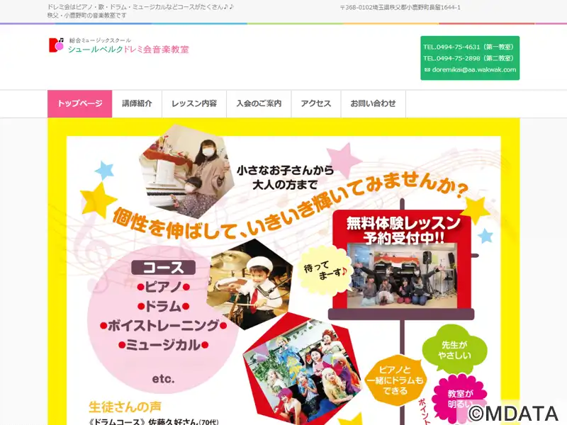 埼玉・秩父郡小鹿野町にある総合ミュージックスクール。ピアノ、歌、ギター・ベース、ドラム、ヒップホップダンス、ミュージカルなど多彩なコースを展開。幼児から大人まで、趣味から音大受験や保育士試験を目指す本格派まで、個々のレベルや目的に応じた指導を行う。年1回のオータムコンサートなど発表会を開催。ミュージカル要素やダンスを取り入れた舞台でアンサンブルや表現力を磨く。明るい雰囲気の中で感性や自己表現を養う。