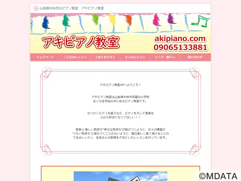 中央市の田富リバーサイドの住宅街にあるピアノ教室。こどものレッスンでは、習い始めからソルフェージュに力を入れ、弾きたい曲を自分の力で表現できるよう指導している。大人のレッスンは要望に合わせて臨機応変に対応し、無理なく続けられるようにサポート。また、リトミックを取り入れた未就園児のプレピアノクラス(個人レッスン)、シニアのためのピアノで脳トレ・グループレッスンも開設している。