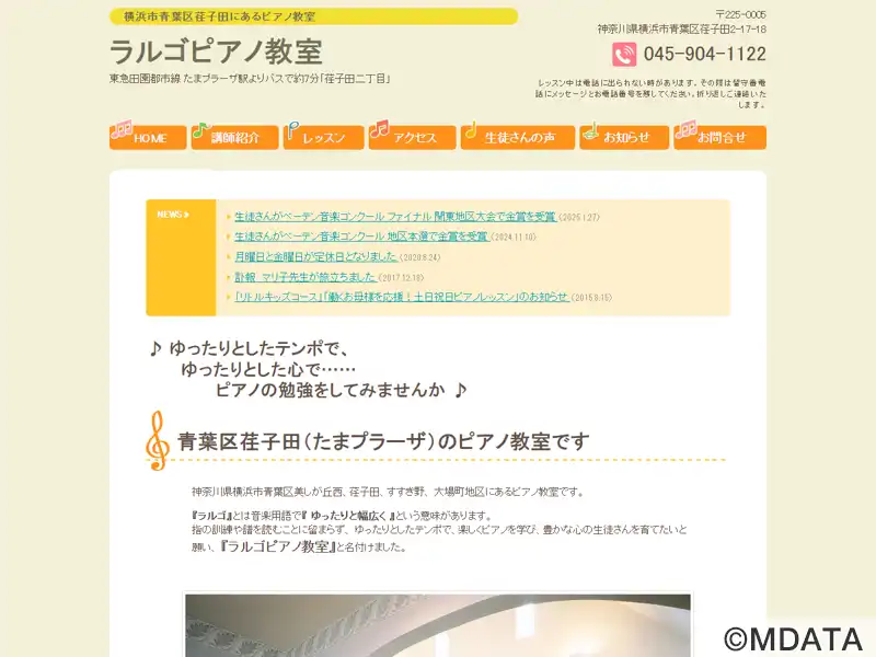 横浜市青葉区荏子田(たまプラーザ)にある「ラルゴピアノ教室」では、ゆったりとしたテンポで楽しくピアノを学び、心豊かな生徒さんを育てるレッスンを行なっている。レッスン室は2部屋あり、連弾や2台ピアノの演奏、アンサンブルも可能。幼稚園生から大人まで、ポピュラーピアノやソルフェージュ(視奏、視唱、聴音、楽典)、ヤマハグレード取得など希望に合わせた丁寧な指導を行い、コンクール入賞や音大合格でも実績をもつ。
