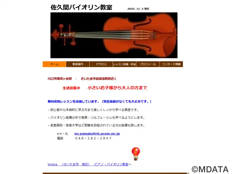 埼玉県川口市(南鳩ヶ谷駅徒歩7分)にあるヴァイオリン教室です。小さなお子さんや趣味で学ぶ初心者から、音楽高校・音楽大学受験を目指すなど本格的に学びたい方まで、楽しくしっかり学べる教室です。また、お子さんと一緒に学びたい方の為に、親子レッスンも開講しております。無料体験レッスンを実施しておりますので、どうぞお気軽にお問い合わせください。