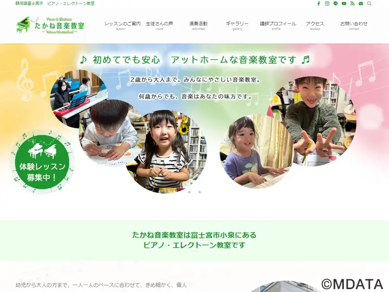富士宮市小泉にあるピアノ・エレクトーン教室です。幼児からシニア世代まで、一人ひとりの個性や進度に合わせた個人レッスンです。ヤマハ個人メソッドを使用し、クラシックの他ポピュラー、童謡唱歌、J-POPなど、個々の好みのジャンルの曲も取り入れています。大人の1曲マスターコース、育脳レッスン「ピアノdeクボタメソッド」、ケンハモ(鍵盤ハーモニカ)レッスンを開講。平日のレッスンは夜9時まで対応しています。