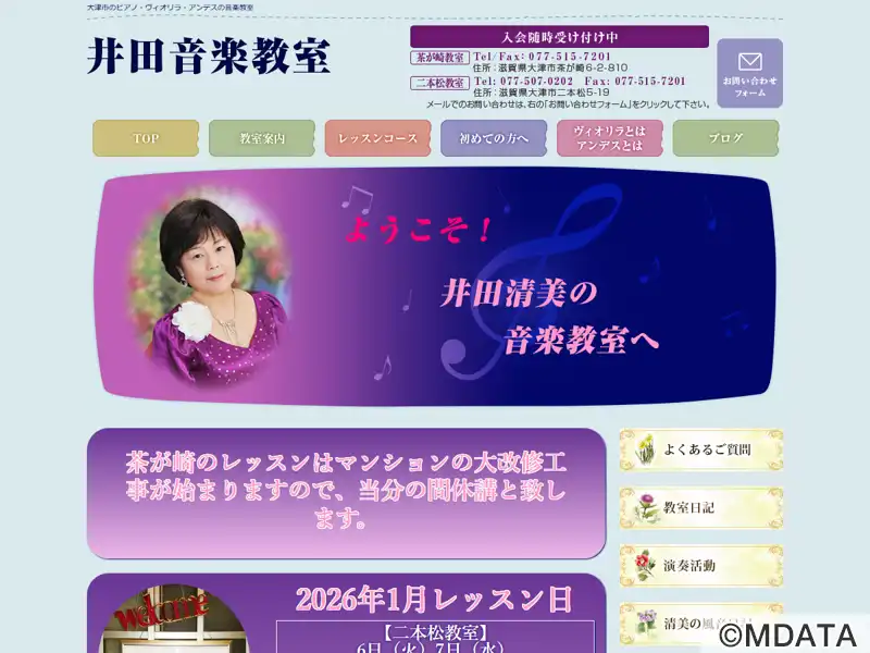 滋賀県大津市の自宅教室で、豊富な指導経験を持つ井田典子氏が主宰する音楽教室。プロを目指す人から、趣味で音楽を楽しむ方まで、幅広いレベルと年齢層に対応している。ピアノ、ヴァイオリン、アンサンブル(団体演奏)の個人レッスンに加え、音楽理論や表現力を強化するカリキュラムも提供している。生徒一人ひとりの目標に合わせた丁寧な指導で、音楽の基礎から高度なテクニックまでサポートし、成長を促す温かな環境が整っている。