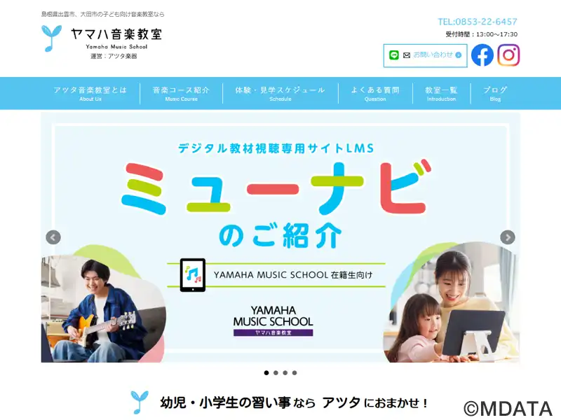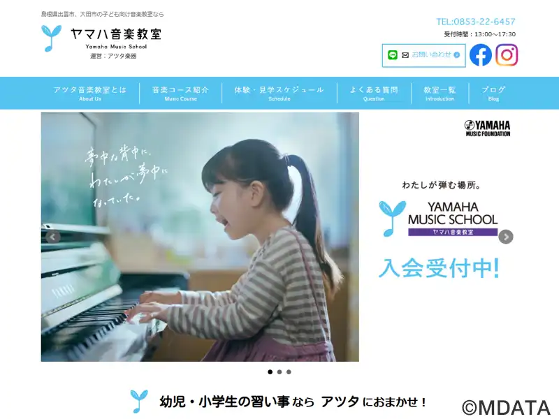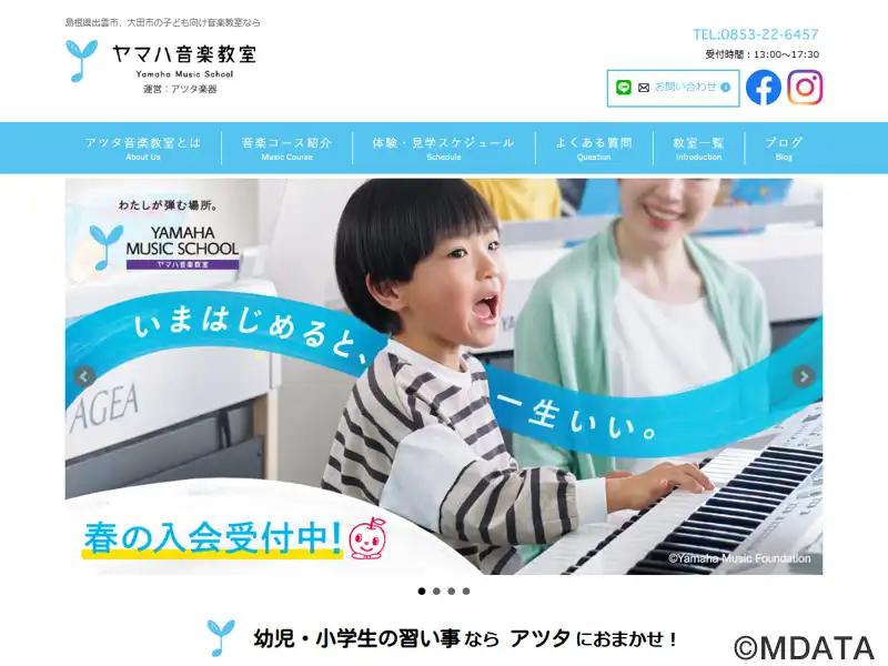 島根県出雲市を拠点とする、アツタ楽器のヤマハ音楽教室レッスンセンター。1歳から小学生まで、年齢に応じたヤマハの独自カリキュラムで音楽力を育む。2~3歳向け「ぷっぷるクラス」では音楽遊びで情緒を養い、3歳の「おんがくなかよしコース」では表現力や音の違いを感じる力を伸ばす。4~5歳の「幼児科」ではメロディーや和音をドレミで理解する基礎を学ぶ。小学生向けジュニアスクールのピアノ・エレクトーンコースも開講。
