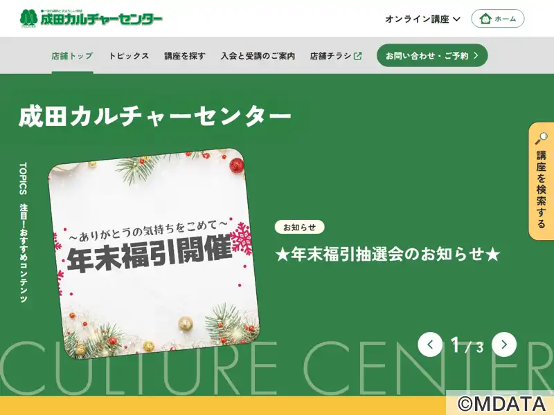 成田市にあるイオンモール成田2階にあるカルチャーセンター。「一流の講師とすばらしい仲間」をモットーに子どもからシニアまで楽しめる多彩なコースを開講。音楽講座はピアノ・電子オルガン、ヴァイオリン、ギター、ドラム、大正琴・胡弓、二胡、琴、三味線・三線、シャンソン・カンツォーネ、コーラス、ポピュラー・ジャズ、ボイストレーニング、和楽器などを開講。JR・京成成田駅からイオンへの直行路線バスが運行している。