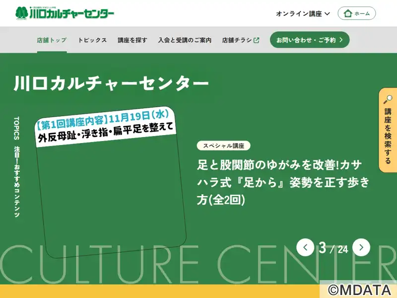 川口市にあるイオンモール川口前川2階にあるカルチャーセンター。子どもからシニアまで楽しめる多彩なコースを開講。音楽講座はピアノ・電子オルガン、ヴァイオリン、ギター、ウクレレ、マンドリン・ハープ、フルート、ハーモニカ、リコーダー・サックス・クラリネット、ドラム、オカリナ、大正琴・胡弓、二胡、琴、三味線・三線、コーラス、ポピュラー・ジャズ、ボイストレーニング、和楽器などを開講。空き教室のレンタル利用も可能。