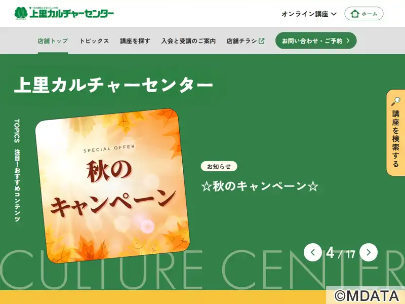 新座市のイオン新座店4階にあるカルチャーセンター。子どもからシニアまで楽しめる多彩なコースを開講。音楽講座はピアノ・電子オルガン、ヴァイオリン、ギター、ウクレレ、フルート、ハーモニカ、リコーダー・サックス・クラリネット、オカリナ、二胡、琴、三味線・三線、シャンソン・カンツォーネ、コーラス、ポピュラー・ジャズ、ボイストレーニング、和楽器・篠笛・太鼓を開講。本庄駅南口より朝日バスでウニクス上里バス停下車。