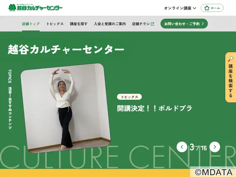 越谷市にあるアルコ越谷ショッピングスクエア地下1Fにある、株式会社カルチャーが運営するカルチャーセンター。「一流の講師とすばらしい仲間」をモットーに子どもからシニアまで楽しめる多彩なコースを開講。音楽講座はピアノ・電子オルガン、ギター、ウクレレ、フルート、オカリナ、二胡、三味線・三線、シャンソン・カンツォーネ、コーラス・愛唱歌、ボイストレーニング、カラオケ、和楽器・篠笛・太鼓を開講。