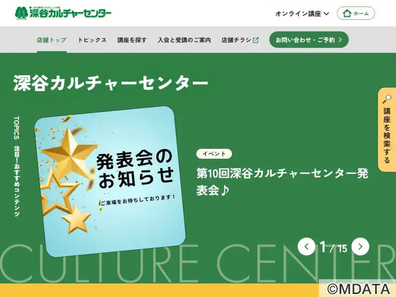 深谷市のショッピングセンターアリオ深谷1Fにあるカルチャーセンター。株式会社カルチャーが運営し、一流の講師とすばらしい仲間と一緒に音楽や歌のレッスンを楽しめる。音楽講座はピアノ・電子オルガン、ヴァイオリン、ギター、ウクレレ、フルート、ハーモニカ、サックス、ドラム、オカリナ、二胡、三味線、コーラス、ボイストレーニング、カラオケなど。子どもからシニアまで楽しく学べる。JR深谷駅から無料シャトルバスあり。