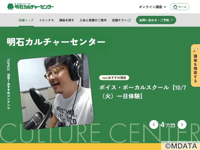明石市のイオン明石ショッピングセンター3番街4階にあるカルチャーセンター。「一流の講師とすばらしい仲間」をモットーに、子どもからシニアまで楽しめる多彩なコースがる。スタッフが要望に応え、魅力的な講師を紹介する。音楽講座では、ピアノ、ヴァイオリン、ギター、ウクレレ、マンドリ、フルート、サックス、クラリネット、オカリナ、二胡、コーラス、ボイストレーニング、カラオケ、和楽器などのコースが開講されている。