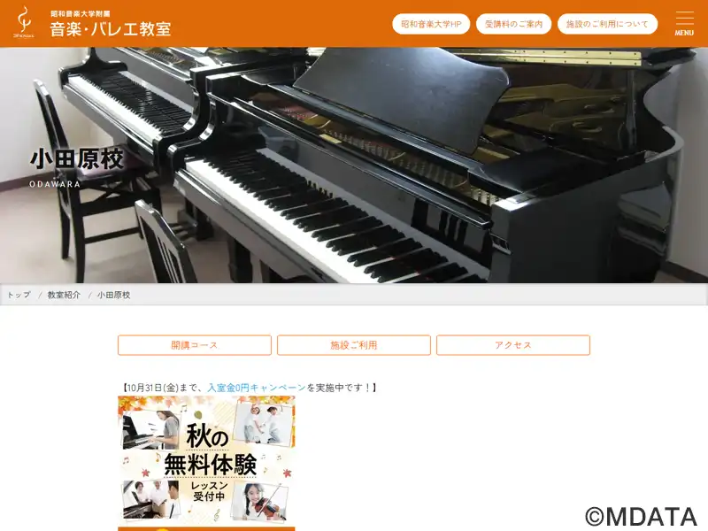 昭和音楽大学附属音楽・バレエ教室の小田原サテライト校。小田原駅東口より徒歩3分、東通り商店街にあり、ピアノ、管楽器、弦楽器、声楽、作曲、ソルフェージュなどの個人レッスン、グループヴォーカル、バレエコース、音大受験・進学コースなど、各自の目的に合わせた多彩なレッスンを実施している。子どもから中高年まで、先生と生徒とのコミュニケーションが良いのが特長。レッスン室・スタジオのレンタルも行っている。