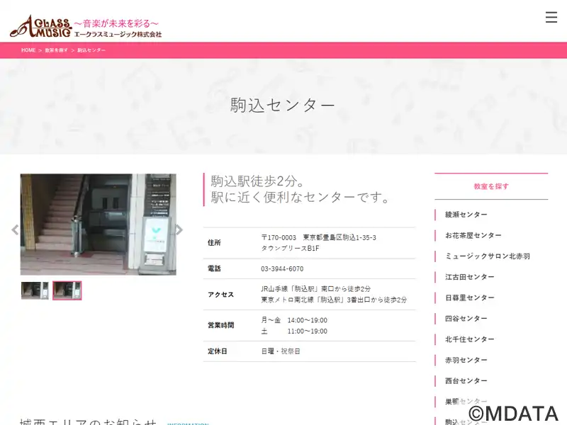 東京都の城東・城北・中央地区を中心に15会場を運営するエー・クラスミュージックの駒込レッスンセンター。子供向けのヤマハ音楽教室やオリジナルコースなど、多彩なレッスンを開講している。ピアノ、ギター、ドラムなどの楽器レッスンがあり、個人・ペア・グループ形式での指導が可能。初心者から経験者まで、年齢や経験を問わず、無理なくレベルアップできる環境を提供。オンラインレッスンやeラーニング講座も充実している。