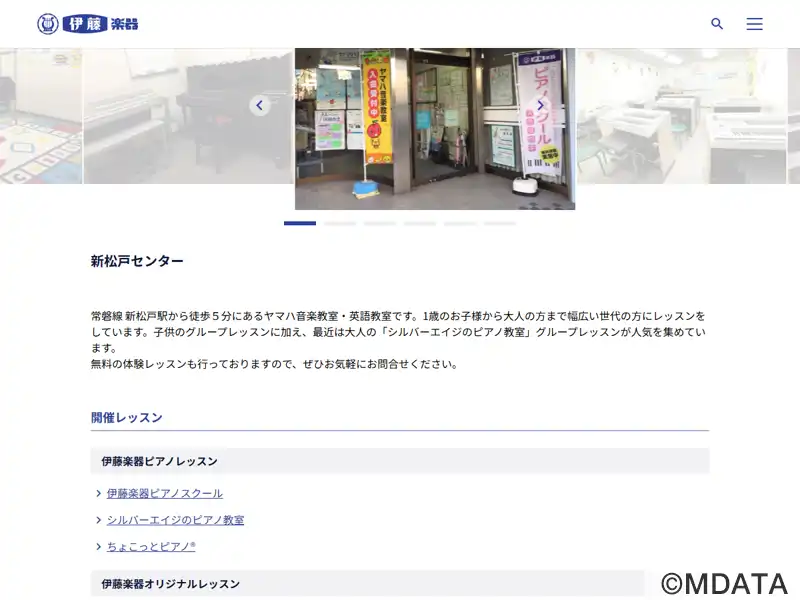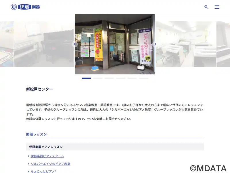 松戸市新松戸にある、明治41年創業の老舗伊藤楽器の、地域に愛される教室を目指すレッスンセンター。ヤマハ認定講師による共通テキストとカリキュラムを用いて、子ども向けの「ヤマハ音楽教室」「ヤマハ英語教室」、大人のための「ヤマハミュージックレッスン」、そして伊藤楽器オリジナルレッスンとしてピアノ、フルート、ヴァイオリン、熟年層を対象とした愉しいグループレッスンのシルバーエイジのピアノコースを開講している。