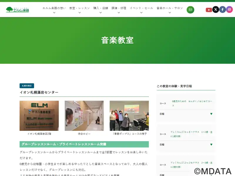 北海道札幌市南区のイオン札幌藻岩店2階にあるエルム楽器のレッスンセンター。グループから、プライベートレッスンルームまで、全7部屋のレッスン室を用意。音楽ルーム全部屋にはグランドピアノ常備、本格的な音楽や楽器を楽しむことができる。ヤマハの認定講師による共通テキストとカリキュラムの、子ども向けには、「ヤマハ音楽教室」、大人向けの「歌って踊れる青春ポップス」と、エルム楽器オリジナルレッスンを開講している。