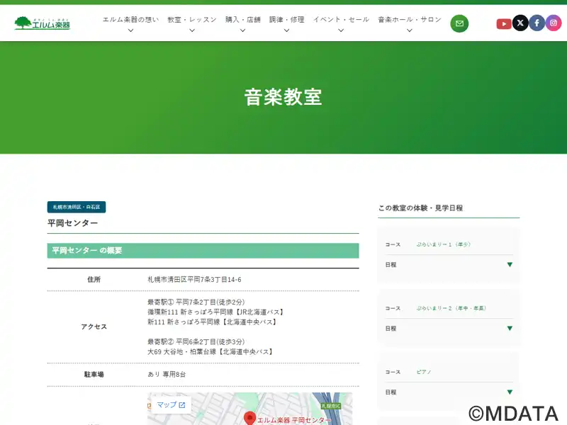 札幌市清田区にある、1974年12月創業の株式会社エルム楽器のレッスンセンター。ヤマハ認定講師による共通テキスト・カリキュラムで行われる「ヤマハ音楽教室」とエルム楽器オリジナルレッスンのピアノコースを開講。生徒一人ひとりのニーズに合わせたオーダーメイドのレッスンを提供し、全年齢対象で「基礎から学びたい」、「憧れの曲を弾きたい」などの要望に応じ、上級グレードや受験対策も行う。専用駐車場を8台完備する。