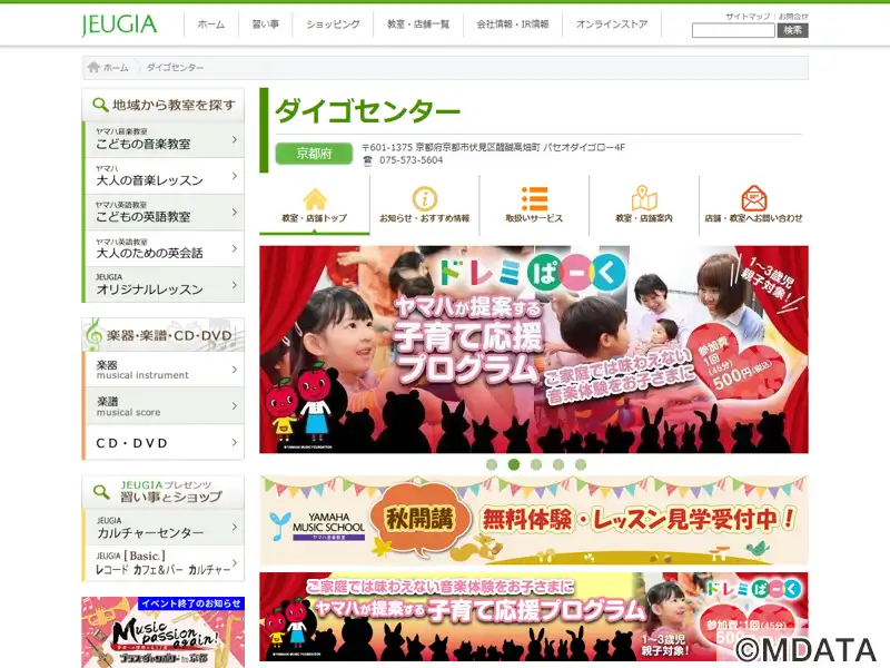 京都市伏見区の地下鉄醍醐駅直結のパセオ・ダイゴロー西館4階にある、1898年創業の京都老舗十字屋楽器店のレッスンセンター。ヤマハ認定講師による共通テキスト、カリキュラムでレッスンを行う、音楽を愛するこころ、感受性、創造性を伸ばす、子ども向けの「ヤマハ音楽教室」、大人のための「大人の音楽レッスン」や、JEUGIAオリジナルレッスンとしてピアノ、エレクトーンコースを開講している。練習室の貸し出しも行う。