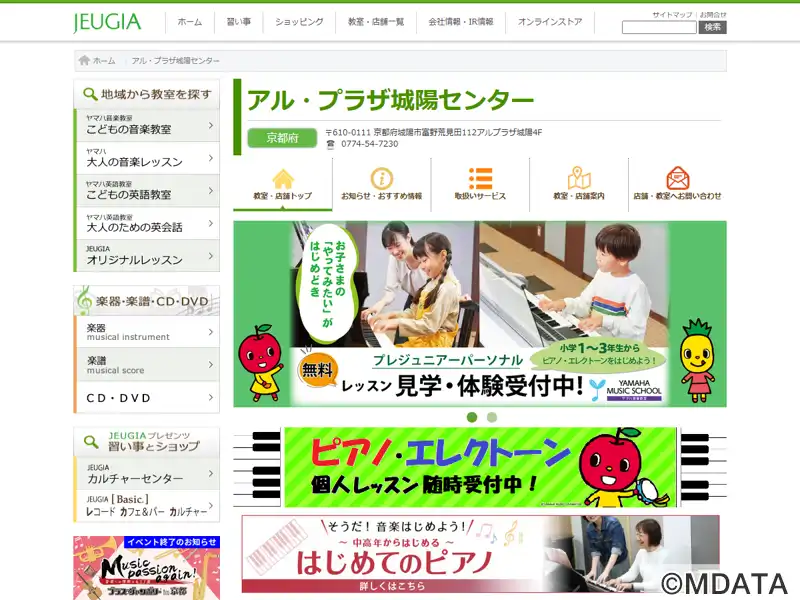 城陽市のアルプラザ城陽本館4階にある十字屋楽器店のレッスンセンター。グループレッスン用の2部屋、個人ピアノ・エレクトーン用の2部屋で、ヤマハ認定講師による共通テキスト、カリキュラムでレッスンを行う、音楽を愛するこころ、感受性、創造性を伸ばす、子ども向けの「ヤマハ音楽教室」、大人のための「大人の音楽レッスン」や、JEUGIA所属講師によるオリジナルレッスン、ピアノ、エレクトーンコースを開講している。