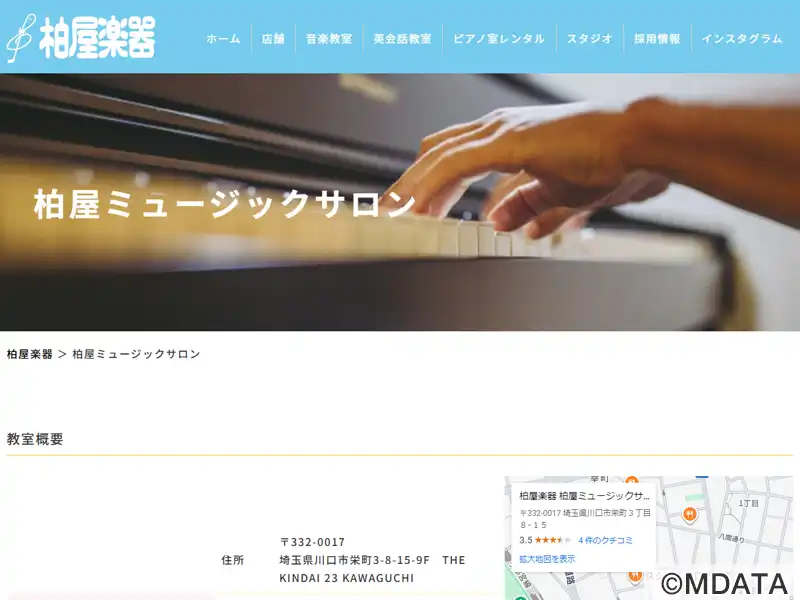 埼玉県の川口駅東口徒歩3分の場所にある柏屋楽器のレッスンセンター。ヤマハ音楽教室の子ども向けの総合音楽教育をはじめ、初心者から上級者まで楽しめる多彩なコースを提供。10室の広々としたレッスンルームを備え、ピアノ、フルート、バイオリン、エレクトーンなどの個別レッスンやグループレッスンに対応。経験豊かな講師が、一人ひとりのペースに合わせた丁寧な指導を行っている。またレッスン室の貸し出しも用意されている。