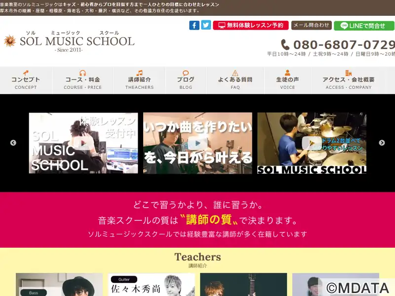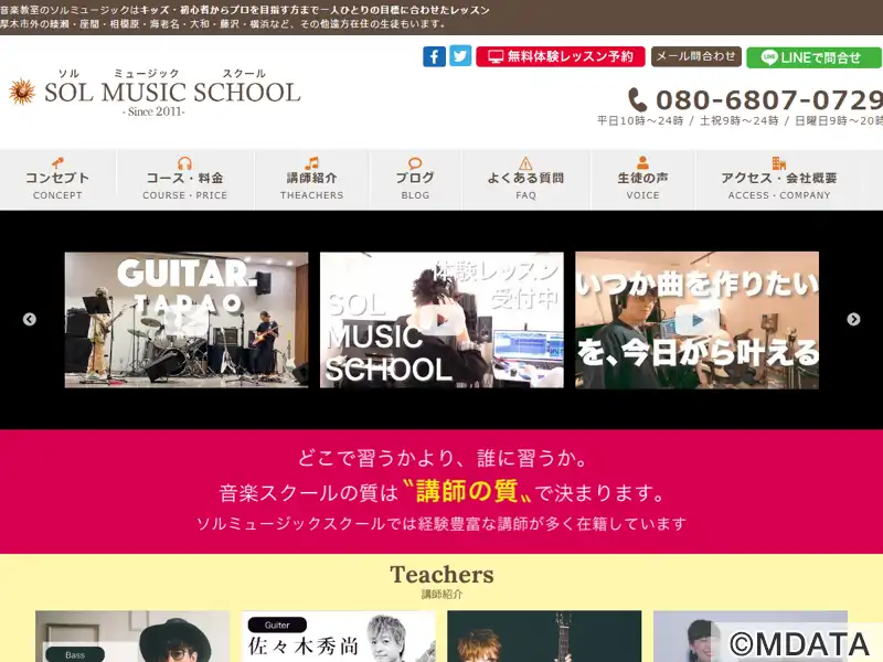 海老名駅から徒歩5分の音楽教室。設備の整ったスタジオで、初心者から一人一人に合わせたマンツーマンのレッスンを提供。ボーカル、ギター、ベース、ドラム、キーボード、作曲、弾き語り、DTM、YouTube/ニコ動制作など様々なコースを開講。また、キッズコースや学生コースなど若い世代のレッスンに力を入れ、スクール主催の発表会ライブなども定期的に開催している。