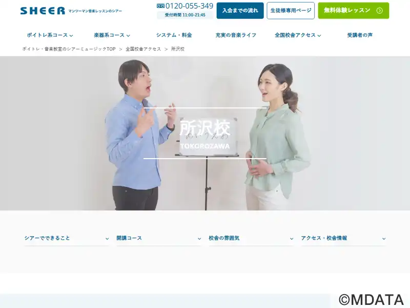 所沢市の所沢駅東口から徒歩3分、ボーカル・ボイストレーニングを中心に全国に音楽教室を展開するシアーミュージックの所沢校。初心者から上級者まで、マンツーマンレッスンによる、ボーカル・ボイストレーニング、ジュニアボーカル、話し方、ピアノ、エレキギター、アコースティックギター、ウクレレなどのコースを開講している。レッスン日時は自由に選択できる。イベントやライブ、発表会なども充実。音楽ライフの充実をサポートする。