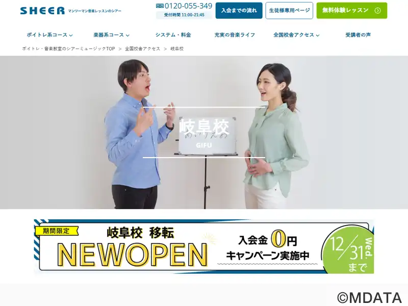 ボーカル・ボイストレーニングを中心に全国に音楽教室を展開するシアーミュージックの岐阜校。ボーカル・ボイストレーニング、ジュニアボーカル、話し方、ピアノ、エレキギター、アコースティックギター、ウクレレのコースを開講し、初心者から上級者まで、目的やペースに合わせたマンツーマンレッスンを提供する。レッスン日時は自由に選択できる。イベントやライブ、発表会なども充実。2025年10月に校舎移転。