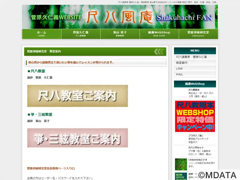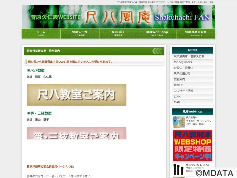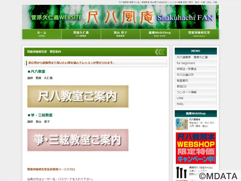 東京都国分寺と札幌市にレッスン場のある尺八、箏・三絃の教室。尺八奏者の菅原久仁義氏と筝演奏家の泉山章子氏が指導を担当しています。老若男女、誰でも気軽に受講できる。尺八については、江戸時代から虚無僧により伝えられた「古典本曲」から、お正月に流れる「春の海」のような琴との合奏曲、童謡、演歌、ポップス作品など、幅広いジャンルを題材とする。マンツーマンレッスンを基本に、合奏レッスンではアンサンブルのコツを学ぶ。