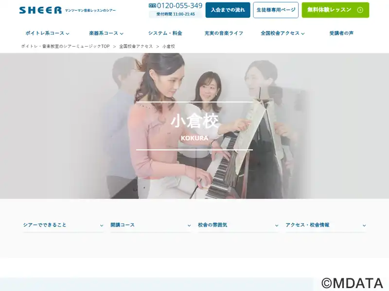 北九州市小倉北区の小倉駅から徒歩3分、ボーカル・ボイストレーニングを中心に全国に音楽教室を展開するシアーミュージックの小倉校。初心者から上級者まで、マンツーマンレッスンによる、ボーカル・ボイストレーニング、ジュニアボーカル、ピアノ、エレキギター、アコースティックギター、ウクレレなどのコースを開講している。レッスン日時は自由に選択できる。イベントやライブ、発表会なども充実。音楽ライフの充実をサポートする。