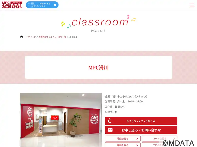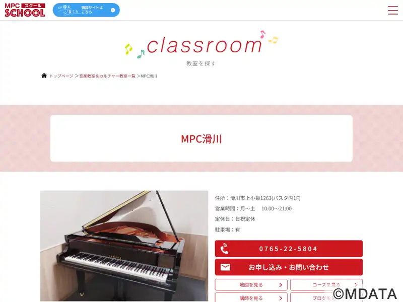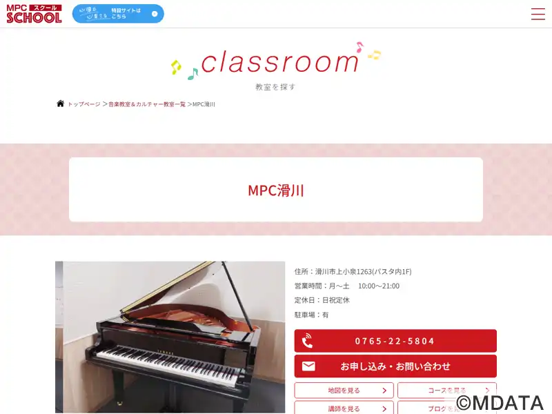 エール横、公園通り2F。MPC滑川では、子どもの年齢に応じて音楽の基礎力を総合的に養うヤマハ音楽教室グループレッスンの他、ピアノ、エレクトーン、大人のピアノコース、シニア世代に人気の脳トレピアノ、フルートやオカリナ、ボーカルなど多彩なコースを開講。個人レッスンは4歳から一人一人の進度に合わせ丁寧に指導します。無料体験レッスン受付中。
