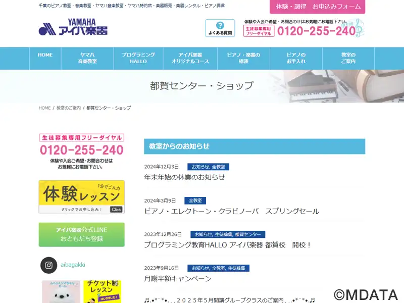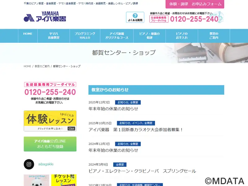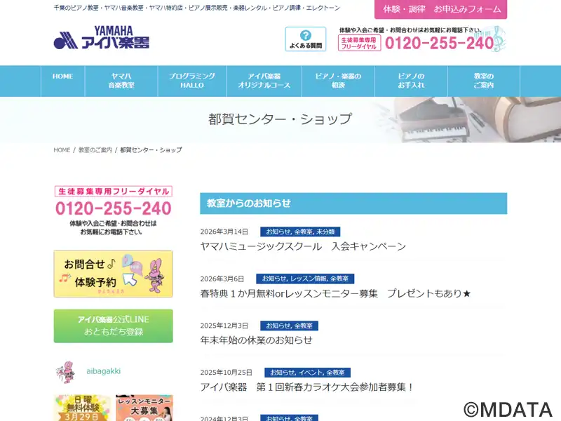 都賀駅西口徒歩1分、アイバ楽器ショップ併設の音楽教室。子どものヤマハ音楽教室各コースをはじめ、アイバ楽器オリジナルコースとして、ピアノ、エレクトーン、クラシックギター、ウクレレ、バイオリン、サックス、声楽、ボイストレーニング、ポピュラーヴォーカル、歌とピアノも両方楽しめるコースなど多彩なレッスンを開講。初心者の方、学生さん、大人の趣味から保育士サポートまで親切に指導します。