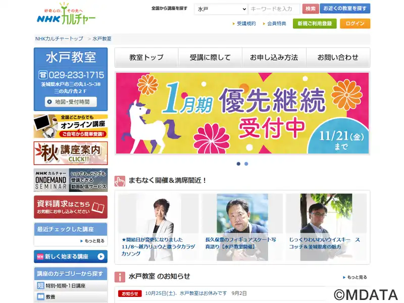 水戸市の三の丸庁舎2階にある、1979年に創業した株式会社NHK文化センターのカルチャー教室。「好奇心の、その先へ」を合言葉に、全国で多彩な講座を提供している。NHKの番組に関連する講座など、NHKグループだからこそできるサービスも提供する。音楽講座としては、ピアノ、カラオケ、ギター、ウクレレ、歌謡曲、シャンソン、ジャズ、演歌、謡曲、大正琴、三味線、尺八、篠笛、二胡、和楽器などのコースを開講している。