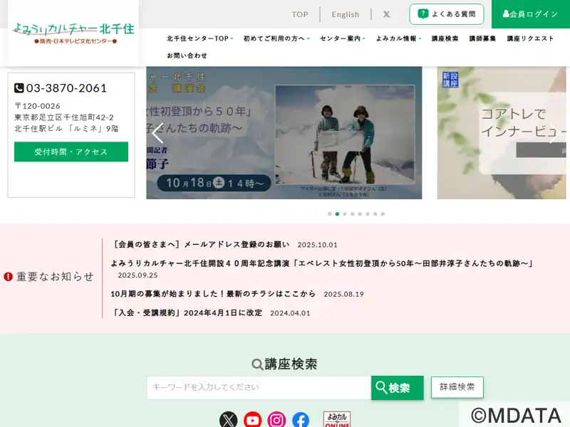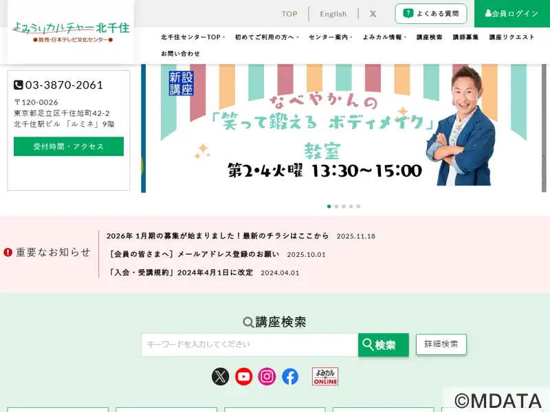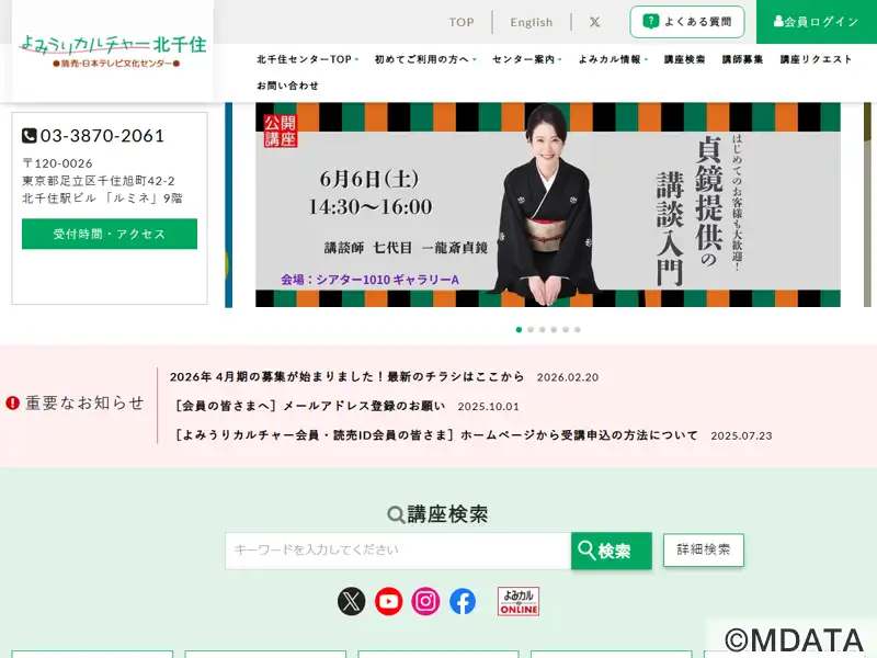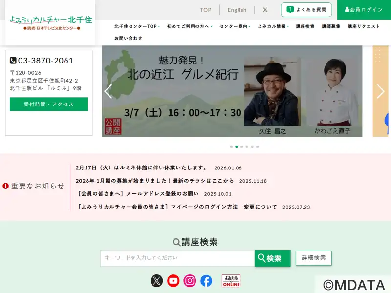 足立区にあるJR北千住駅ルミネ9階にある、株式会社読売・日本テレビ文化センターが運営するカルチャースクール。音楽講座では、ピアノ、ギター、ヴォイストレーニング、ウクレレ、オカリナ、フルート、シャンソン、バイオリン、クラリネット、ハーモニカ、フォークソング、ジャズボーカル、オペラ、ボサノバ、ダンス、エンジェルハープ、二胡などのさまざまなコースを開講。初心者歓迎。個人レッスンで、レベルに合わせて学べる。